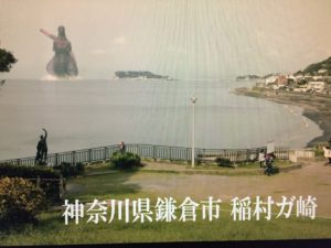 映画のシーンでは、稲村ケ崎公園から江の島を望む方向、湘南の海にゴジラが出現します。
